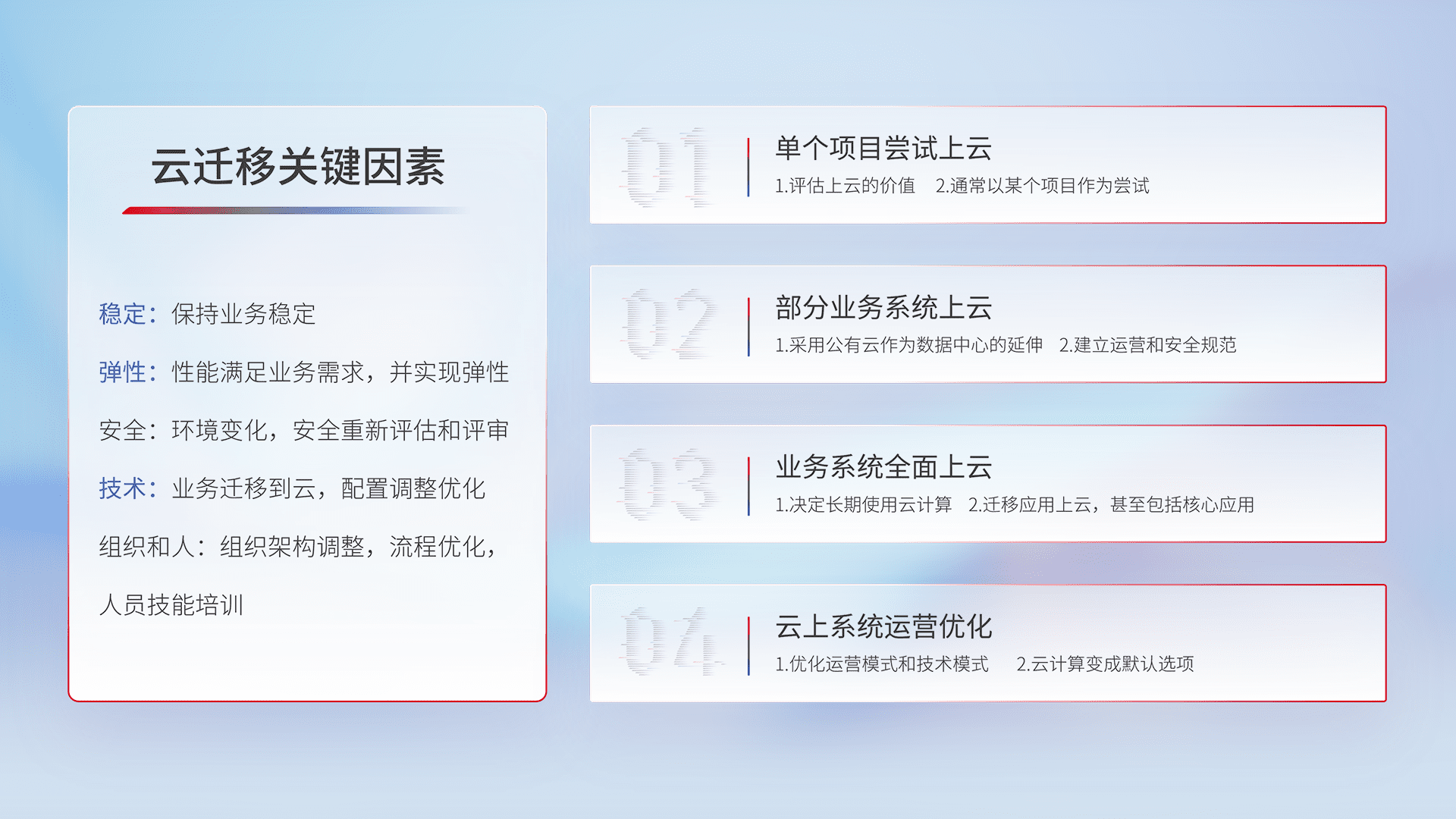 结合实际业务,,,,从规划设计、、云平台选型、、、云原生改造、、、、数据迁移、、集成交付,,,迁移全过程为客户识别最佳上云路径,,,做好风险识别管理,,设计网络架构、、、身份权限、、、安全审计合规、、操作审计、、、日志审计、、、、监控告警策略、、、、多站点容灾设计等,,,对云上基础设施进行整体规划,,提升IT治理水平,,以满足弹性、、、、高可用、、、高性能的需求。。。