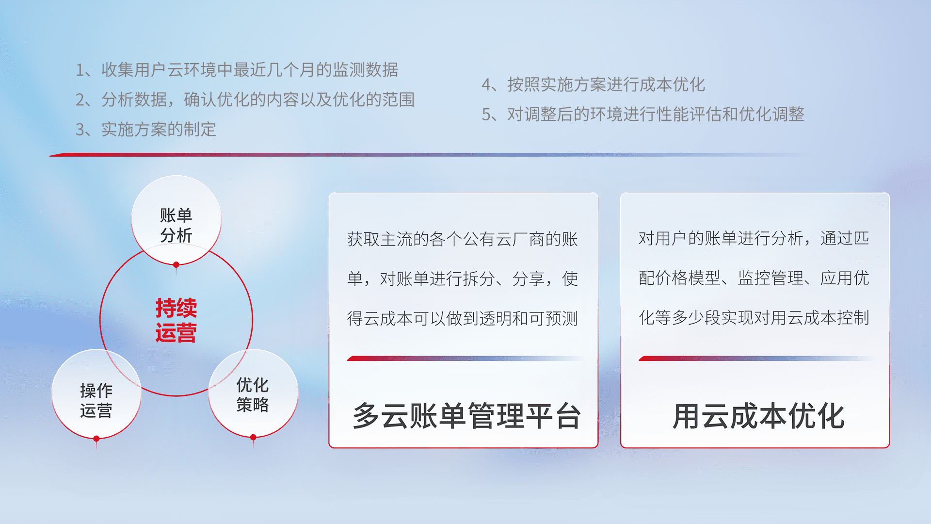 通过多云纳管,,,,以统一的资源数据模型把客户的云资源进行抽象和封装,,进而实现对多云资源的统一操作,,保障云资源管理的可靠性、、、、稳定性与可用性。。。。量身定制化运维内容,,配置、、开发运维、、、补丁管理、、、备份、、、监控、、认证和访问管理、、审计和日常巡检等,,,,保障在用云过程中的可靠度,,稳定度以及高可用率。。